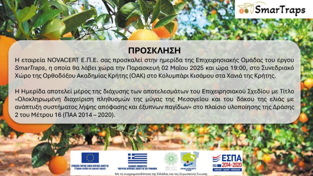 Η εταιρεία NOVACERT Ε.Π.Ε. σας προσκαλεί στην ημερίδα της Επιχειρησιακής Ομάδας του έργου SmarTraps, η οποία θα λάβει χώρα την Παρασκευή 02 Μαΐου 2025 και ώρα 19:00, στο Συνεδριακό Χώρο της Ορθοδόξου Ακαδημίας Κρήτης (ΟΑΚ) στο Κολυμπάρι Κισάμου στα Xανιά της Κρήτης.