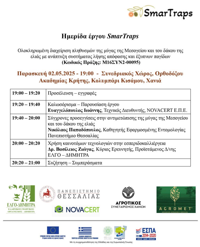 Η Ημερίδα αποτελεί μέρος της διάχυσης των αποτελεσμάτων του Επιχειρησιακού Σχεδίου με Τίτλο «Ολοκληρωμένη διαχείριση πληθυσμών της μύγας της Μεσογείου και του δάκου της ελιάς με ανάπτυξη συστήματος λήψης απόφασης και έξυπνων παγίδων» στο πλαίσιο υλοποίησης της Δράσης 2 του Μέτρου 16 (ΠΑΑ 2014 – 2020).